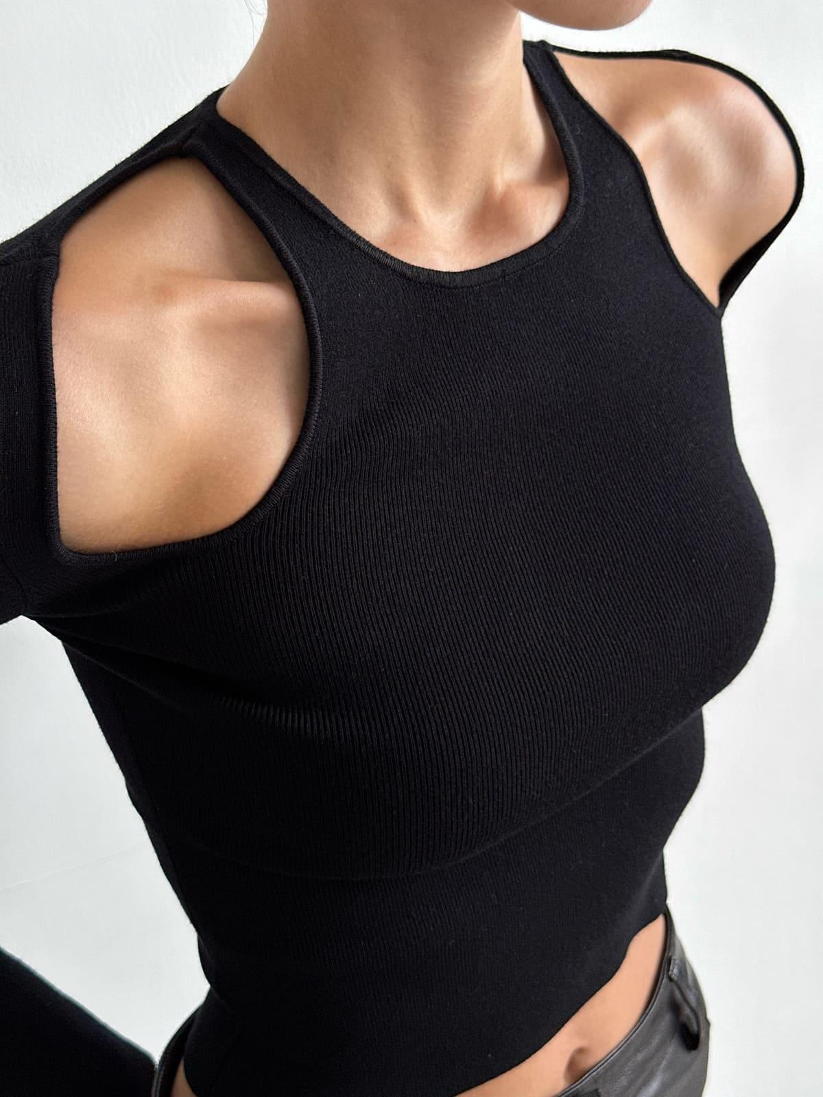 Лонглслив с облегающим кроем и фигурными вырезами на плечах, создающими имитацию майки, надетой с топом.Арт.: AMW3_C408