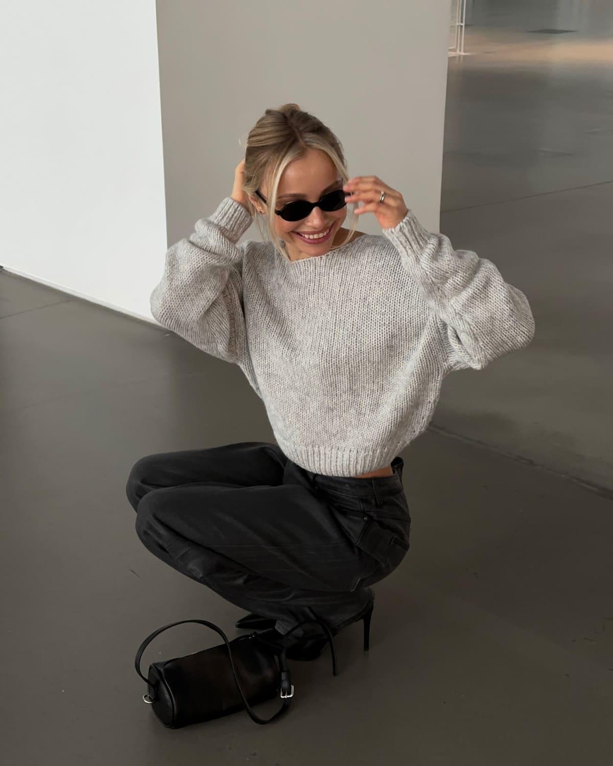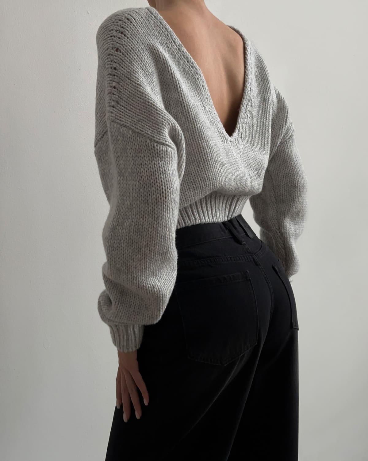 Укороченный джемпер с V-образным вырезом на спине выполнен из теплой пряжи с добавлением нежного кашемира. Спущенная линия плеч в сочетании со свободным силуэтом создают женственный образ.Арт.: GNW2_C418