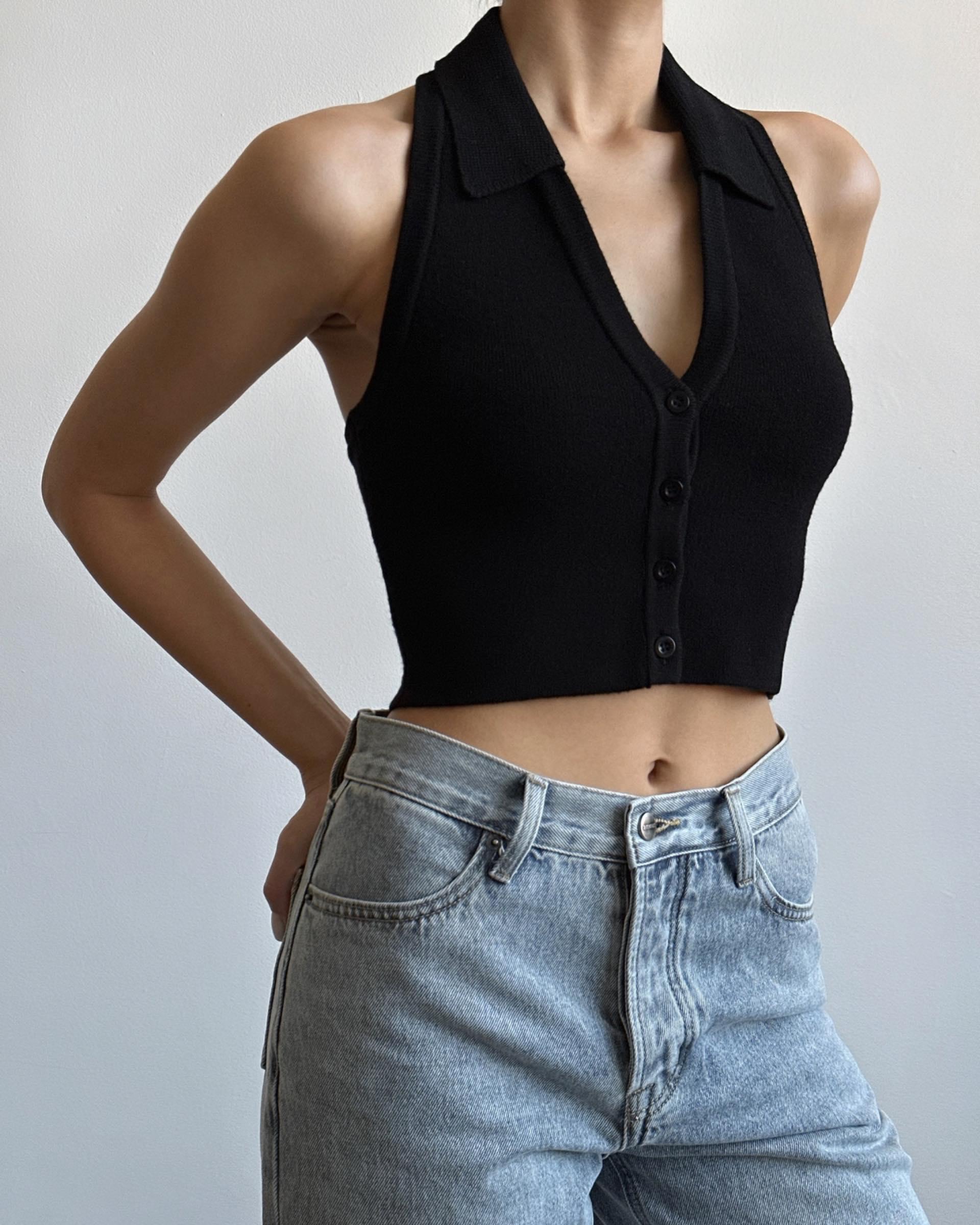 Однотонный жилет с вырезом халтер и открытой спиной будет отлично смотреться с денимом. Облегающий крой красиво подчеркивает линии фигуры.Арт.: AMS2_C101