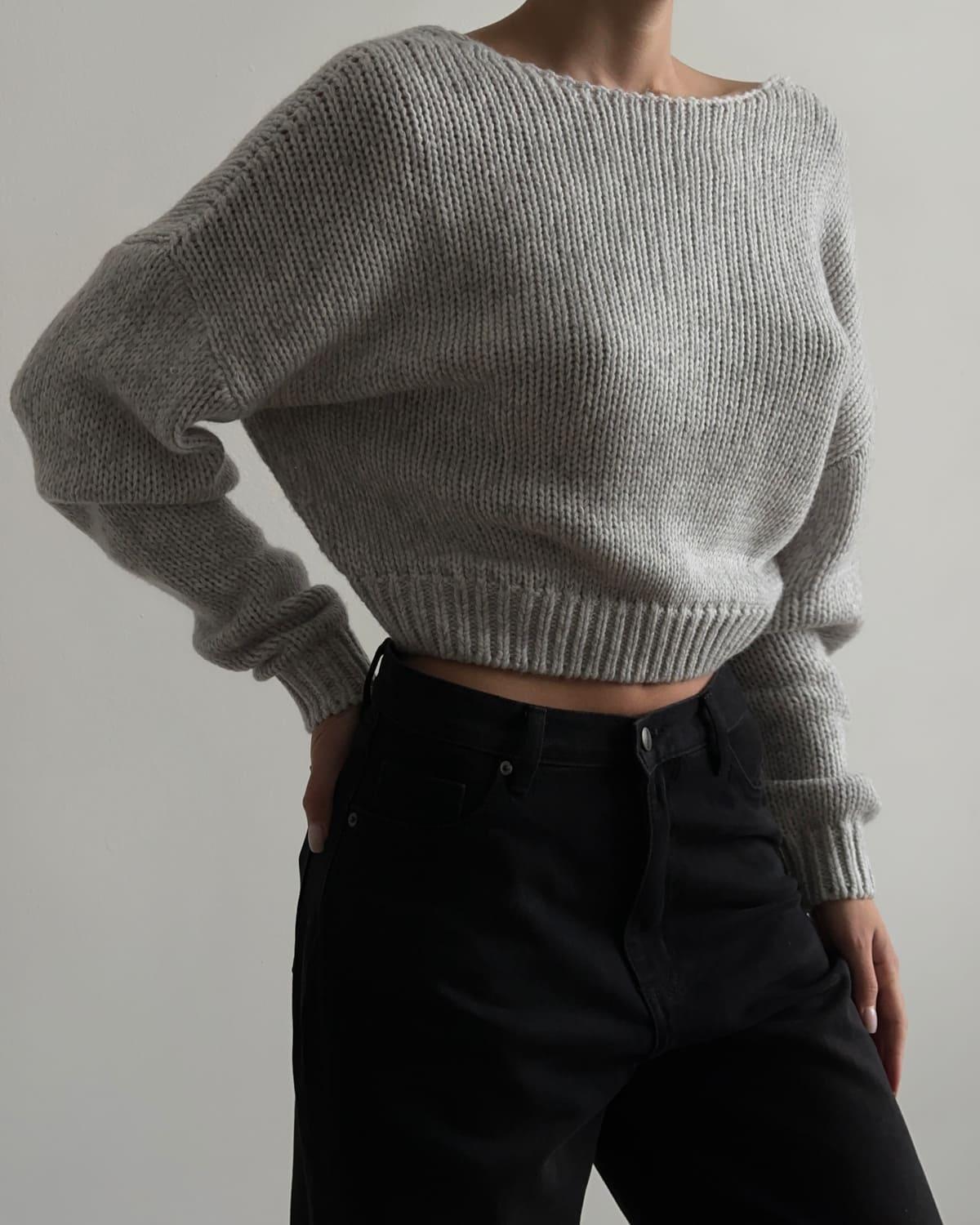 Укороченный джемпер с V-образным вырезом на спине выполнен из теплой пряжи с добавлением нежного кашемира. Спущенная линия плеч в сочетании со свободным силуэтом создают женственный образ.Арт.: GNW2_C418